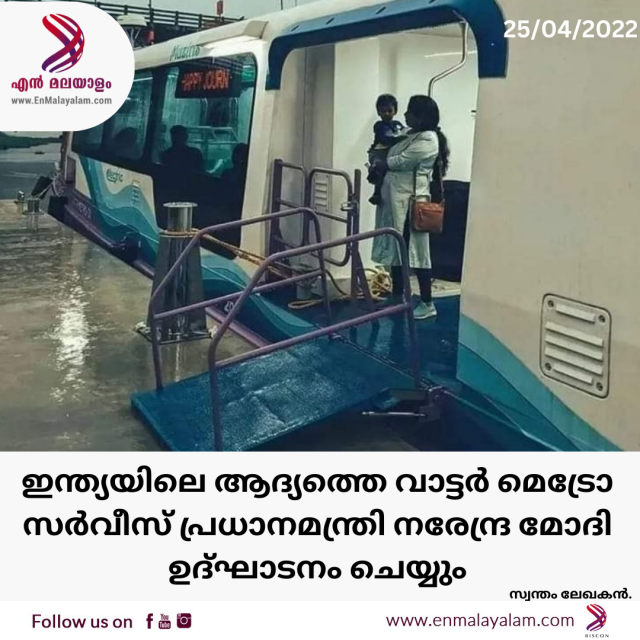 ഇന്ത്യയിലെ ആദ്യത്തെ വാട്ടർ മെട്രോ സർവീസ് പ്രധാനമന്ത്രി നരേന്ദ്ര മോദി ഉദ്ഘാടനം ചെയ്യും.