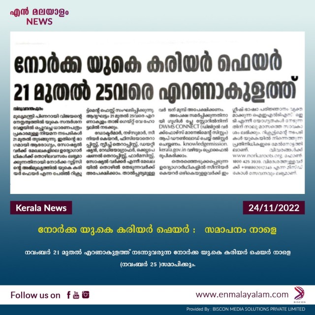 നവംബര് 21 മുതല് എറണാകുളത്ത് നടന്നുവരുന്ന നോര്ക്ക യു.കെ കരിയര് ഫെയര് നാളെ (നവംബർ 25 )സമാപിക്കും. സൈക്യാട്രി സ്പെഷാലിറ്റി ഡോക്ടര്മാര്, വിവിധ സ്പെഷാലിറ്റികളിലേയ്ക്കുളള നഴ്സുമാര്, സീനിയര് കെയറര്, ഫിസിയോതെറാപ്പിസ്റ്റ്, സ്പീച്ച് തെറാപ്പിസ്റ്റ്, ഡയറ്റീഷ്യന്, റേഡിയോഗ്രാഫര്, ഒക്ക്യുപ്പേഷണല് തെറാപ്പിസ്റ്റ്, ഫാര്മസിസ്റ്റ്, സോഷ്യല് വര്ക്കര് എന്നിങ്ങനെ 13 മേഖലകളില് നിന്നുളളവർക്കാണ് റിക്രൂട്ട്മെന്റിൽ പങ്കെടുക്കാന് അവസരം ലഭിച്ചത്.