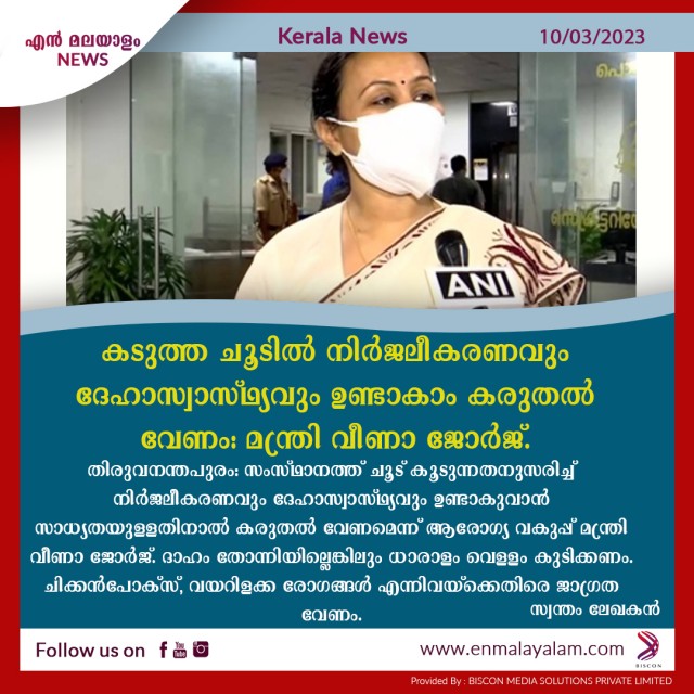 കടുത്ത ചൂടില് നിര്ജലീകരണവും ദേഹാസ്വാസ്ഥ്യവും ഉണ്ടാകാം കരുതല് വേണം: മന്ത്രി വീണാ ജോര്ജ്.