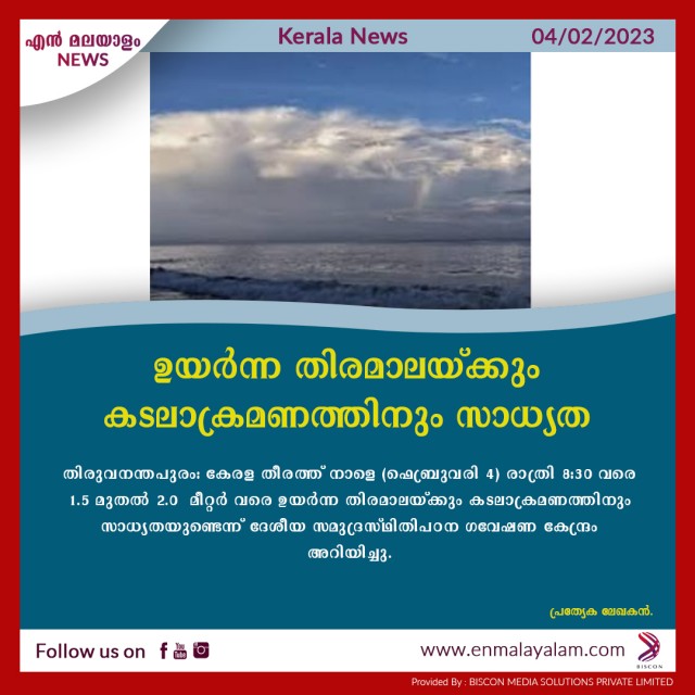 തിരുവനന്തപുരം: കേരള തീരത്ത് നാളെ (ഫെബ്രുവരി 4) രാത്രി 8:30 വരെ 1.5 മുതൽ 2.0 മീറ്റർ വരെ ഉയർന്ന തിരമാലയ്ക്കും കടലാക്രമണത്തിനും സാധ്യതയുണ്ടെന്ന് ദേശീയ സമുദ്രസ്ഥിതിപഠന ഗവേഷണ കേന്ദ്രം അറിയിച്ചു. ഈ സാഹചര്യത്തിൽ സംസ്ഥാന ദുരന്ത നിവാരണ അതോറിറ്റി മൽസ്യത്തൊഴിലാളികൾക്കും തീരദേശവാസികൾക്കും ജാഗ്രത മുന്നറിയിപ്പ് നൽകി. കടൽക്ഷോഭം രൂക്ഷമാകാൻ സാധ്യതയുള്ളതിനാൽ അപകട മേഖലകളിൽ നിന്ന് അധികൃതരുടെ നിർദേശാനുസരണം മാറി താമസിക്കണം. ബോട്ട്, വള്ളം മുതലായ മൽസ്യബന്ധന യാനങ്ങൾ ഹാർബറിൽ സുരക്ഷിതമായി കെട്ടിയിടണം. വള്ളങ്ങൾ തമ്മിൽ സുരക്ഷിത അകലം പാലിക്കുന്നത് കൂട്ടിയിടിച്ചുള്ള അപകട സാധ്യത ഒഴിവാക്കും.മൽസ്യബന്ധന ഉപകരണങ്ങളുടെ സുരക്ഷ ഉറപ്പാക്കണം. ബീച്ചിലേക്കുള്ള യാത്രകളും കടലിൽ ഇറങ്ങിയുള്ള വിനോദങ്ങളും പൂർണ്ണമായും ഒഴിവാക്കണമെന്നും അറിയിപ്പിൽ പറയുന്നു.
