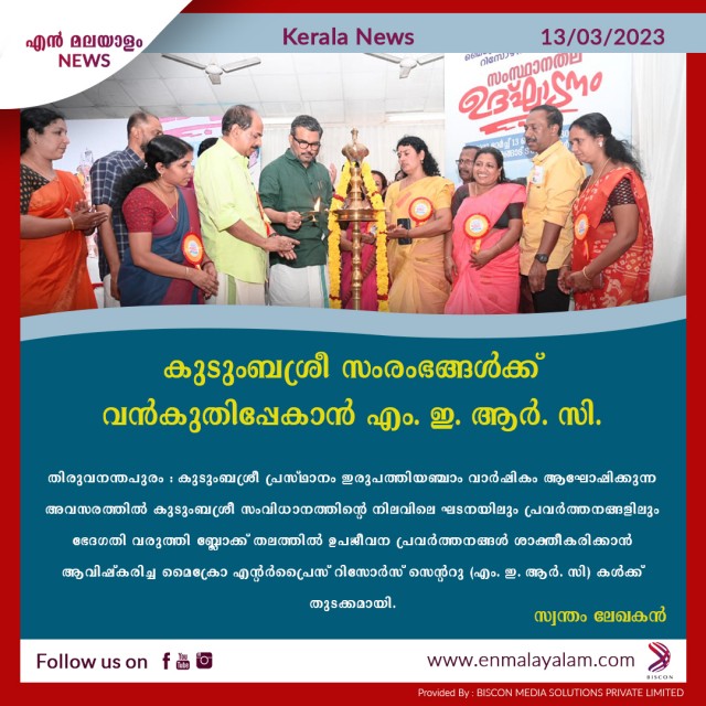 തിരുവനന്തപുരം : കുടുംബശ്രീ പ്രസ്ഥാനം ഇരുപത്തിയഞ്ചാം വാർഷികം ആഘോഷിക്കുന്ന അവസരത്തിൽ കുടുംബശ്രീ സംവിധാനത്തിന്റെ നിലവിലെ ഘടനയിലും പ്രവർത്തനങ്ങളിലും ഭേദഗതി വരുത്തി ബ്ലോക്ക് തലത്തിൽ ഉപജീവന പ്രവര്ത്തനങ്ങള് ശാക്തീകരിക്കാന് ആവിഷ്കരിച്ച മൈക്രോ എന്റർപ്രൈസ് റിസോർസ് സെന്ററു (എം. ഇ. ആർ. സി) കള്ക്ക് തുടക്കമായി. മൈക്രോ എന്റർപ്രൈസ് റിസോർസ് സെന്റർ (എം. ഇ. ആർ. സി) സംസ്ഥാനതല ഉദ്ഘാടനം നെടുമങ്ങാട് ടൗണ് ഹാളില് തദ്ദേശ സ്വയംഭരണ വകുപ്പു മന്ത്രി എം. ബി രാജേഷ് നിര്വഹിച്ചു. പ്രാദേശിക സാമ്പത്തിക വികസനം കൈവരിക്കാനുള്ള ഉപാധിയായി മൈക്രോ എന്റർപ്രൈസ് റിസോർസ് സെന്റർ പ്രവര്ത്തിക്കുമെന്ന് അദ്ദേഹം പറഞ്ഞു. കുടുംബശ്രീ പ്രസ്ഥാനം കഴിഞ്ഞ 25 വർഷം കൊണ്ട് അതിന്റെ ലക്ഷ്യം നിറവേറ്റി. സാമ്പത്തിക സ്വാശ്രയത്തിലൂടെയുള്ള ദാരിദ്ര്യ നിർമാർജനമായിരുന്നു കുടുംബശ്രീയുടെ പ്രധാന ലക്ഷ്യം. അത് പ്രാവർത്തികമായിക്കഴിഞ്ഞു. ഇനി വരുമാന വർധനവാണ് ലക്ഷ്യം. ഇതിനായി ബ്ലോക്ക് തലത്തിൽ ഒരു ഏകജാലക സംവിധാനം ഉണ്ടാക്കും. യഥാര്ഥ ഉപഭോക്താക്കളെ കണ്ടെത്തല്, സംരംഭങ്ങള് ആരംഭിക്കുന്നതിനുള്ള സഹായം ഉറപ്പു വരുത്തല്, വായ്പകള്ക്ക് ആവശ്യമായ വിവിധ അനുമതികള് നേടിയെടുക്കാന് സഹായിക്കല് എന്നിവയാണ് എം. ഇ. ആർ. സിയുടെ ലക്ഷ്യം. ബ്ലോക്ക് തലത്തില് മേഖലാതല കണ്സോര്ഷ്യം രൂപീകരിക്കല്, നൂതന സംരഭ മാതൃകകള് രൂപീകരിക്കല് തുടങ്ങിയവയും ലക്ഷ്യങ്ങളാണെന്നും മന്ത്രി പറഞ്ഞു.