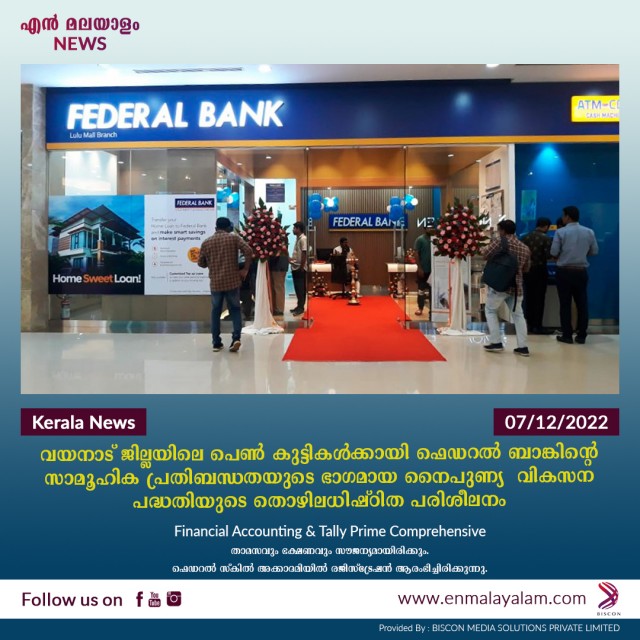 വയനാട് ജില്ലയിലെ പെണ് കുട്ടികള്ക്കായി ഫെഡറൽ ബാങ്കിന്റെ സാമൂഹിക പ്രതിബന്ധതയുടെ ഭാഗമായ നൈപുണ്യ വികസന പദ്ധതിയുടെ തൊഴിലധിഷ്ഠിത പരിശീലനം