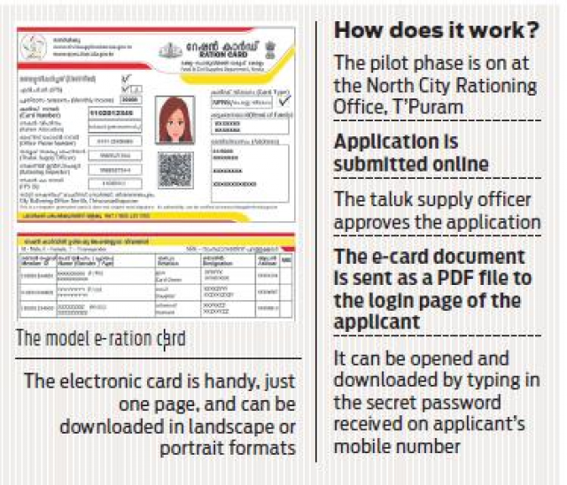 നാഷണൽ ഇൻഫർമാറ്റിക് സെന്റർ ആണ് ഈ - റേഷൻകാർഡി നുള്ള സാങ്കേതിക സൗകര്യമൊരുക്കിയത്. 50 - രൂപയാണ് ഫീസ്. ഈ - ട്രഷറി സംവിധാനത്തിലൂടെ ഓൺലൈനായി അടയ്ക്കാം. ഈ - റേഷൻ കാർഡിന് അകത്തെ പേജുകൾ ഉണ്ടാകില്ല. പുതിയ അംഗങ്ങളെ ചേർക്കുക, ഒഴിവാക്കുക, എൻ.ആർ.ഐ നില മാറ്റുക എന്നിങ്ങനെ തുടങ്ങി മാറ്റങ്ങൾക്കും ഇത്തരത്തിൽ അപേക്ഷിക്കാം. മെയ് -3 മുതൽ ഇത് പ്രാബല്യത്തിൽ വരുമെന്ന് സിവിൽ സപ്ലൈസ് ഐ ടി സെൽ അധികൃതർ അറിയിച്ചു. പൈലറ്റ് പദ്ധതിയായി തിരുവനന്തപുരത്ത് മന്ത്രി പി.തിലോത്തമൻ ഉദ്ഘാടനം ചെയ്തിരുന്നു. ഇത് വിജയിച്ചതോടെയാണ് എല്ലാ ജില്ലകളിലേക്കും വ്യാപിപ്പിക്കുന്നത്.