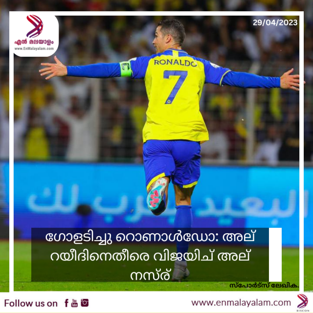 കൊച്ചി: വെള്ളിയാഴ്ച നടന്ന സൗദി പ്രൊ ലീഗ് ഫുട്ബോളിൽ അൽ റയീദിനെതിരെ 4 ഗോളുകൾക്ക് വിജയിച് അൽ നസ്ർ. നാലാം മിനിറ്റിലെ റൊണാൾഡോയുടെ ഗോൾ അൽ നസ്റിന് ലീഡ് കൊടുത്തു. റൊണാള്ഡോ അല് നസ്റിന് വേണ്ടി ഈ സീസണില് നേടുന്ന 12-ാം ഗോളാണിത്. ഈ ഗോളോടുകൂടി ടൂര്ണമെന്റിലെ ടോപ് സ്കോററായി താരം മാറി. 55-ാo മിനിറ്റിലെ അബ്ദുൽറഹ്മാൻ ഗരീബിന്റെ ഗോൾ അല് റയീദിന്റെ വിജയലക്ഷ്യം ഇരട്ടിയാക്കി. പിന്നീട് 90-ാo മിനിറ്റിൽ മുഹമ്മദും എക്സ്ട്രാ ടൈമിലെ നാലാം മിനിറ്റിൽ അബ്ദുൽമജീദ് അൽ സുലൈഹീമും ഗോളുകൾ അടിച്ചു അൽ റയീദിനെ തകർത്തു. നിലവില് 25 മത്സരങ്ങളില് നിന്ന് 56 പോയന്റുമായി ടീം പോയന്റ് പട്ടികയില് രണ്ടാമതാണ് അൽ നസ്ർ. 24 മത്സരങ്ങളില് നിന്ന് 59 പോയന്റുള്ള അല് ഇത്തിഹാദാണ് പട്ടികയില് ഒന്നാമത്.