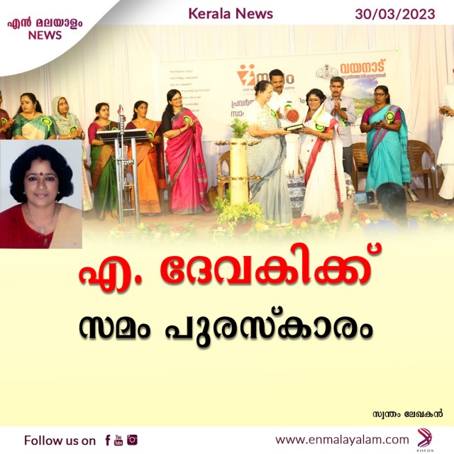 മുൻ വയനാട് ജില്ലാ പഞ്ചായത്ത് പ്രസിഡൻ്റ് ,വൈസ് പ്രസിഡൻ്റ് ,ആരോഗ്യ- വിദ്യഭ്യാസ സ്റ്റാൻ്റിങ്ങ് കമ്മറ്റി ചെയർമാനുമായിരുന്ന എ. ദേവകിക്ക് സമം പുരസ്കാരം. കേരള സർക്കാരിന്റെ ,,,,,,,,സമം,, പരിപാടയിൽ ഏറ്റവും നന്നായി വിവിധ മേഘലയിൽ പ്രവർത്തിക്കുന്ന 'വർക്ക് ഏർപെടുത്തിയപുരസ്കാരം 10 പേർക്ക് ലഭിച്ചു. രാഷ്ട്രീയ സാമുഹിക പ്രവർത്തന മികവിനാണ് എ.ദേവകിക് പുരസ്കാരം ലഭിച്ചത്. സാക്ഷരതാ മേഘലയിലെ പ്രവർത്തനങ്ങൾക്ക് നേതൃത്വം നൽകി. കുടുംബശ്രീ പ്രവർത്തനം കേരളത്തിലെ ആദ്യത്തെ പട്ടിക വർഗ്ഗ ജില്ലാ പഞ്ചായത്ത് വൈസ് പ്രസിഡണ്ടുമായിരുന്നു എ .ദേവകി.