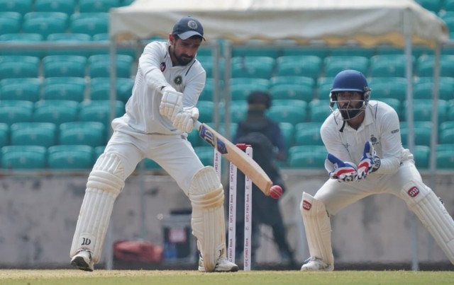 മറുപടി ബാറ്റിങ്ങിന് ഇറങ്ങിയ മധ്യപ്രദേശിന് ഓപ്പണർ ഗർഷ് ഗാവ്ലിയുടെ വിക്കറ്റ് തുടക്കത്തിൽ തന്നെ നഷ്ടമായി. എന്നാൽ ഹിമൻശു മന്ത്രിയും ശുഭം ശർമ്മയും ചേർന്നുള്ള കൂട്ടുകെട്ട് ഇന്നിങ്സ് മുന്നോട്ടു നീക്കി. ഹിമൻസു മന്ത്രി 31 റൺസെടുത്ത് പുറത്തായി. കളി നിർത്തുമ്പോൾ ശുഭം ശർമ്മ 46ഉം രജത് പട്ടീദാർ 50ഉം റൺസ് നേടി ക്രീസിലുണ്ട്