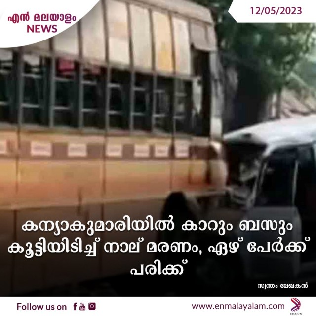 കന്യാകുമാരിയിൽ കാറും ബസും കൂട്ടിയിടിച്ച് നാല് മരണം, ഏഴ് പേർക്ക് പരിക്ക്"