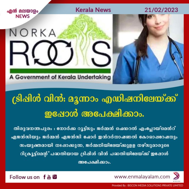 തിരുവനന്തപുരം : നോർക്ക റൂട്ട്സും ജർമ്മൻ ഫെഡറൽ എംപ്ലോയ്മെന്റ് ഏജൻസിയും ജർമ്മൻ ഏജൻസി ഫോർ ഇന്റർനാഷണൽ കോ-ഓപ്പറേഷനും സംയുക്തമായി നടപ്പാക്കുന്ന, ജർമ്മനിയിലേയ്ക്കുളള നഴ്സുമാരുടെ റിക്രൂട്ട്മെന്റ് പദ്ധതിയായ ട്രിപ്പിൾ വിൻ പദ്ധതിയിലേയ്ക്ക് ഇപ്പോൾ അപേക്ഷിക്കാം. ബിരുദമോ ഡിപ്ലോമയോ ഉള്ള നഴ്സുമാർ ക്കാണ് അവസരം. ഏപ്രിൽ 19 മുതൽ 28 വരെ തിരുവനന്തപുരത്ത് ജർമ്മൻ ഡെലിഗേഷൻ നേരിട്ട് നടത്തുന്ന ഇന്റര്വ്യൂവിലൂടെ തെരഞ്ഞെടുക്കപ്പെടുന്നവർക്ക് ഗോയ്ഥേ ഇൻസ്റ്റിറ്റ്യൂട്ടിൽ ജർമ്മൻ ഭാഷാപരിശീലനം (ബി 1 ലെവൽ വരെ) നൽകി ജർമ്മനിയിലെ ആരോഗ്യമേഖലയിലേയ്ക്ക് റിക്രൂട്ട് ചെയ്യും. മലയാളികളായ സ്ത്രീകൾക്കും പുരുഷന്മാർക്കും അപേക്ഷിക്കാവുന്നതാണ്.