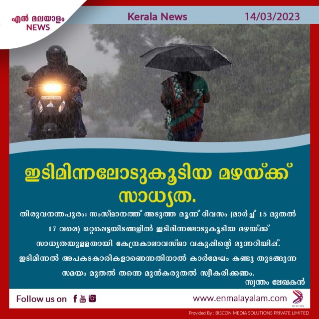 തിരുവനന്തപുരം: സംസ്ഥാനത്ത് അടുത്ത മൂന്ന് ദിവസം (മാർച്ച് 15 മുതൽ 17 വരെ) ഒറ്റപ്പെട്ടയിടങ്ങളിൽ ഇടിമിന്നലോടുകൂടിയ മഴയ്ക്ക് സാധ്യതയുള്ളതായി കേന്ദ്രകാലാവസ്ഥാ വകുപ്പിന്റെ മുന്നറിയിപ്പ്. ഇടിമിന്നൽ അപകടകാരികളാണെന്നതിനാൽ കാർമേഘം കണ്ടു തുടങ്ങുന്ന സമയം മുതൽ തന്നെ മുൻകരുതൽ സ്വീകരിക്കണം. ഈ സാഹചര്യത്തിൽ സംസ്ഥാന ദുരന്ത നിവാരണ അതോറിറ്റി പൊതുജനങ്ങൾക്കായി ജാഗ്രതാ നിർദേശങ്ങൾ പുറത്തിറക്കി. ഇടിമിന്നൽ ലക്ഷണം കണ്ടാൽ തുറസായസ്ഥലങ്ങളിൽ നിൽക്കുന്നത് ഒഴിവാക്കണം. ജനലും വാതിലും അടച്ചിടണം. ഗൃഹോപകരണങ്ങളുടെ വൈദ്യുതി ബന്ധം വിച്ഛേദിക്കണം. വൈദ്യുതി ഉപകരണങ്ങളുമായുള്ള സാമിപ്യം ഒഴിവാക്കണം. തുണികൾ എടുക്കാൻ ടെറസിലോ, മുറ്റത്തോ ഇടിമിന്നലുള്ള സമയത്ത് പോകരുത്. അന്തരീക്ഷം മേഘാവൃതമെങ്കിൽ കുട്ടികളെ തുറസായ സ്ഥലത്തും, ടെറസ്സിലും കളിക്കാൻ അനുവദിക്കരുത്. ഇടിമിന്നൽ സമയത്ത് ടെറസിലോ ഉയരമുള്ള സ്ഥലങ്ങളിലോ വൃക്ഷക്കൊമ്പിലോ ഇരിക്കുന്നത് അപകടകരമാണ്. പട്ടം പറത്തുന്നത് ഒഴിവാക്കണം ഇടിമിന്നലുള്ള സമയത്ത് വൃക്ഷങ്ങളുടെ ചുവട്ടിൽ നിൽക്കരുത്. വാഹനങ്ങൾ മരച്ചുവട്ടിൽ പാർക്ക് ചെയ്യരുത്. കാറ്റിൽ വീഴാൻ സാധ്യതയുള്ള വസ്തുക്കൾ കെട്ടിവെക്കണം. ഇടിമിന്നൽ സമയത്ത് ടെലഫോൺ ഉപയോഗിക്കരുത്. മിന്നലാഘാതമേറ്റ ആളിന്റെ ശരീരത്തിൽ വൈദ്യുത പ്രവാഹം ഉണ്ടാകില്ല. മിന്നലേറ്റ ആളിന് ഉടൻ വൈദ്യ സഹായം എത്തിക്കണം. ജലാശയത്തിൽ മീൻ പിടിക്കാനും കുളിക്കാനും ഇറങ്ങരുത്. ഇടിമിന്നൽ സമയങ്ങളിൽ വാഹനത്തിനുള്ളിൽ സുരക്ഷിതരായിരിക്കുമെന്നതിനാൽ വാഹനമോടിക്കുന്നവർ അതിനുള്ളിൽ തുടരണം.സൈക്കിൾ, ബൈക്ക്, ട്രാക്ടർ തുടങ്ങിയ വാഹനങ്ങളിലുള്ള യാത്ര ഒഴിവാക്കണമെന്നും ജാഗ്രത നിർദേശത്തിൽ പറയുന്നു.