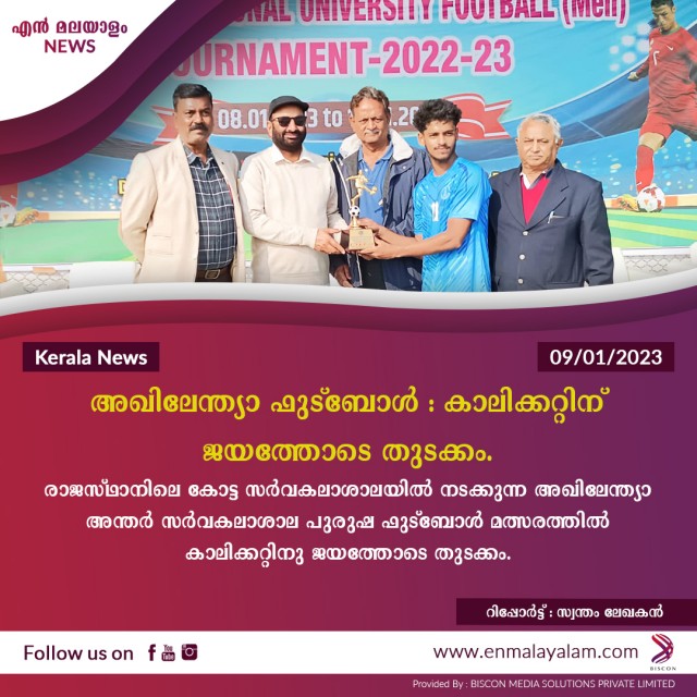 രാജസ്ഥാനിലെ കോട്ട സര്വകലാശാലയില് നടക്കുന്ന അഖിലേന്ത്യാ അന്തര് സര്വകലാശാല പുരുഷ ഫുട്ബോള് മത്സരത്തില് കാലിക്കറ്റിനു ജയത്തോടെ തുടക്കം. ലീഗ് റൗണ്ടിലെ ആദ്യ മത്സരത്തില് എതിരില്ലാത്ത 5 ഗോളുകള്ക്ക് ജബല്പുര് റാണി ദുര്ഗവതി സര്വകലാശാലയെയാണ് നിലവിലെ ചാമ്പ്യന്മാരായ കാലിക്കറ്റ് പരാജയപ്പെടുത്തിയത്. കാലിക്കറ്റിനു വേണ്ടി കളിയുടെ 27-ാം മിനിറ്റില് ഷംനാദ് ആദ്യ ഗോള് നേടി. 32-ാം മിനിറ്റില് പെനാല്റ്റിയിലൂടെ സഫ്നീത് രണ്ടാം ഗോള് കരസ്ഥമാക്കി. 52-ാം മിനിറ്റില് സനൂപും, 68-ാം മിനിറ്റില് ഷംനാദും 75-ാം മിനിറ്റില് അക്ബര് സിദ്ധിഖും കാലിക്കറ്റിന് വേണ്ടി വല കുലുക്കി. കളിയിലെ മികച്ച താരമായി കാലിക്കറ്റിന്റെ അക്ബര് സിദ്ധീഖ് തിരഞ്ഞെടുക്കപ്പെട്ടു. ചൊവ്വാഴ്ച കൊല്ക്കത്ത അദമാസ് യൂണിവേഴ്സിറ്റിയുമായാണ് കാലിക്കറ്റിന്റെ മത്സരം. യു. കെ. നിസാമുദ്ധീന് നായകനായ സര്വകലാശാലാ ടീമിന്റെ മുഖ്യ പരിശീലകന് സതീവന് ബാലനാണ്. സഹപരിശീലകന് : മുഹമ്മദ് ഷഫീക്, മാനേജര് : ഷിഹാബുദീന്, ഫിസിയോ : ഡെന്നി ഡേവിസ് എന്നിവരാണ്.
