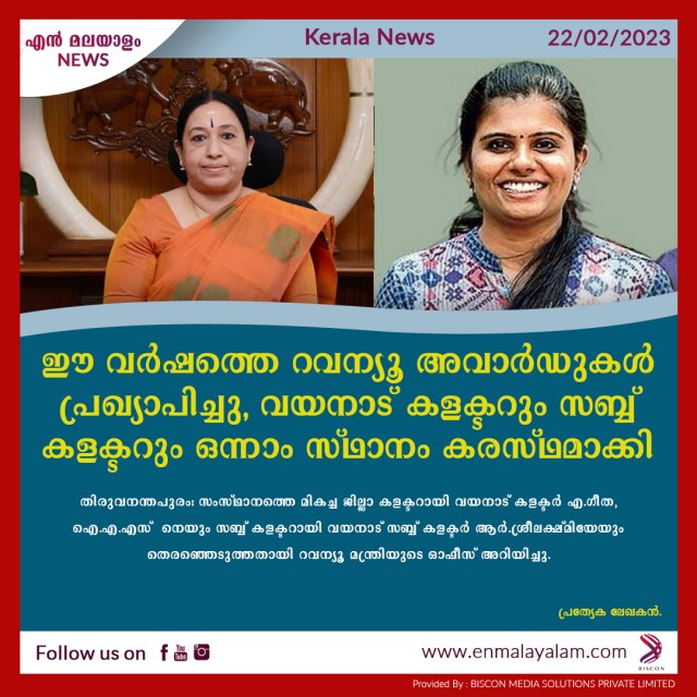ഈ വര്ഷത്തെ റവന്യൂ അവാര്ഡുകള് പ്രഖ്യാപിച്ചു, വയനാട് കളക്ടറും സബ്ബ് കളക്ടറും ഒന്നാം സ്ഥാനം കരസ്ഥമാക്കി