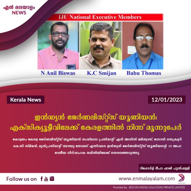 ഇന്ഡ്യന് ജേര്ണലിസ്റ്റ്സ് യൂണിയന്: എക്സിക്യൂട്ടീവിലേക്ക് കേരളത്തിൽ നിന്ന് മൂന്നുപേർ