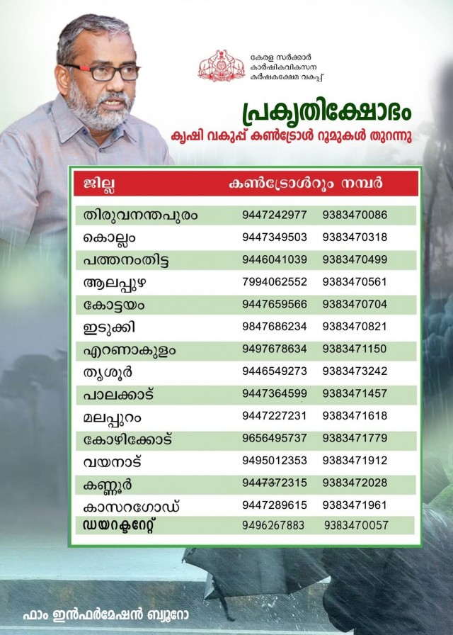 സംസ്ഥാനത്ത് നിലവിലെ കനത്ത മഴ മൂലം കാർഷിക വിളകൾക്കുണ്ടാകുന്ന നാശനഷ്ടം വിലയിരുത്തുന്നതിനും, അതുമായി ബന്ധപ്പെട്ട പ്രവർത്തനങ്ങൾക്ക് മേൽനോട്ടം വഹിക്കുന്നതിനുമായി എല്ലാ ജില്ലകളിലും കൺട്രോൾ റൂമുകൾ തുറന്നിട്ടുണ്ട്. ജില്ലകളിലെ കണ്ട്രോൾ റൂമുകളുടെ നമ്പറുകൾ ചുവടെ ചേർക്കുന്നു.