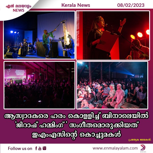 ആസ്വാദകരെ ഹരം കൊള്ളിച്ച് ബിനാലെയിൽ 'ജിറാഫ് ഹമ്മിംഗ്. സംഗീതമൊരുക്കിയത് ഇഎംഎസിന്റെ കൊച്ചുമകൾ