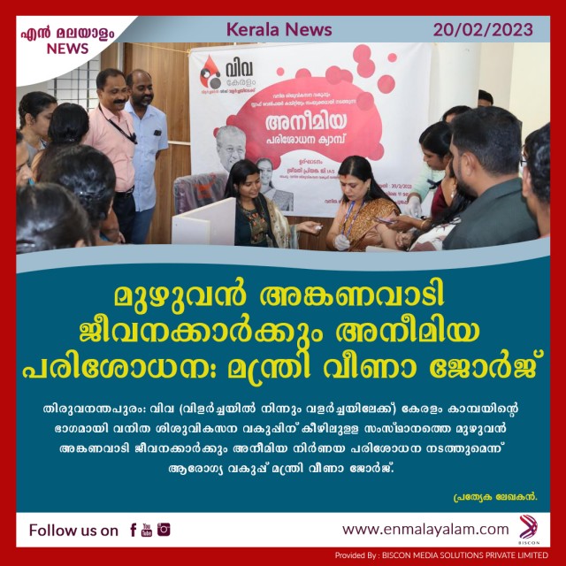 മുഴുവന് അങ്കണവാടി ജീവനക്കാര്ക്കും അനീമിയ പരിശോധന: മന്ത്രി വീണാ ജോര്ജ്