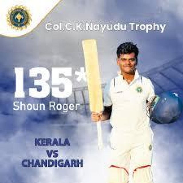 സി കെ നായിഡു ട്രോഫിയിൽ ചണ്ഡീഗഢിനെതിരെ കേരളത്തിന് മികച്ച സ്കോർ. ഷോൺ റോജറിൻ്റെ സെഞ്ച്വറി മികവിൽ കേരളം ആദ്യ ഇന്നിങ്സിൽ 384റൺസെടുത്തു. രണ്ടാം ദിവസം കളി നിർത്തുമ്പോൾ ചണ്ഡീഗഢ് നാല് വിക്കറ്റ് നഷ്ടത്തിൽ 245 റൺസെന്ന നിലയിലാണ്.