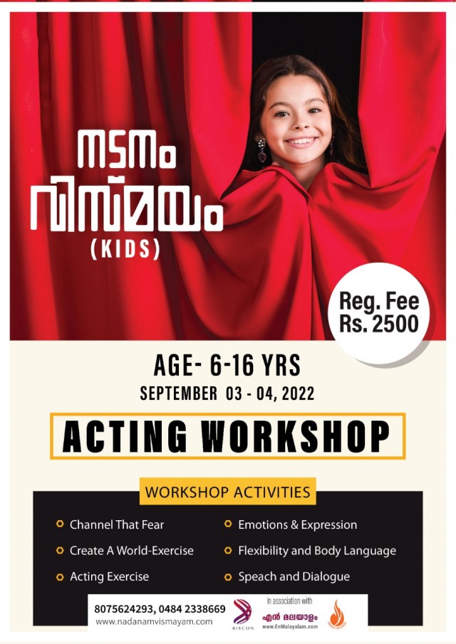 .അഭിനയത്തിൽ അഭിരുചിയുള്ള കുട്ടികളെ അവരുടെ കഴിവുകൾ കണ്ടെത്തി കൂടുതൽ മികവുറ്റതാക്കാൻ വേണ്ടി ഈ വരുന്ന സെപ്റ്റംബർ മൂന്ന് , നാല് തിയതികളിലായി എൻമലയാളം ഓണ്ലൈൻ മീഡിയയും ഡോൺ ബോസ്കോ യൂത്ത് സിർവിസെസും ചേർന്ന് വടുതലയിലുള്ള ഡോൺ ബോസ്കോ ഫിലിം ഇൻസ്റ്റിറ്റ്യൂട്ടിൽ വെച്ച് ഒരു ആക്ടിങ് വർക് ഷോപ് സംഘടിപ്പിക്കുന്നു.