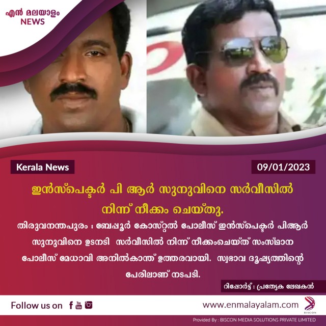 തിരുവനന്തപുരം : ബേപ്പൂർ കോസ്റ്റൽ പോലീസ് ഇൻസ്പെക്ടർ പിആർ സുനുവിനെ ഉടനടി സർവീസിൽ നിന്ന് നീക്കംചെയ്ത് സംസ്ഥാന പോലീസ് മേധാവി അനിൽകാന്ത് ഉത്തരവായി. സ്വഭാവ ദൂഷ്യത്തിന്റെ പേരിലാണ് നടപടി.