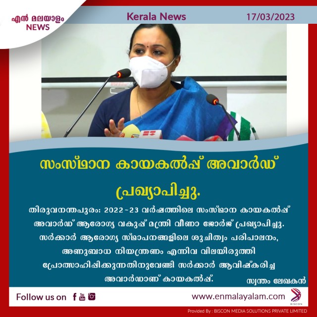 സംസ്ഥാന കായകല്പ്പ് അവാര്ഡ് പ്രഖ്യാപിച്ചു.