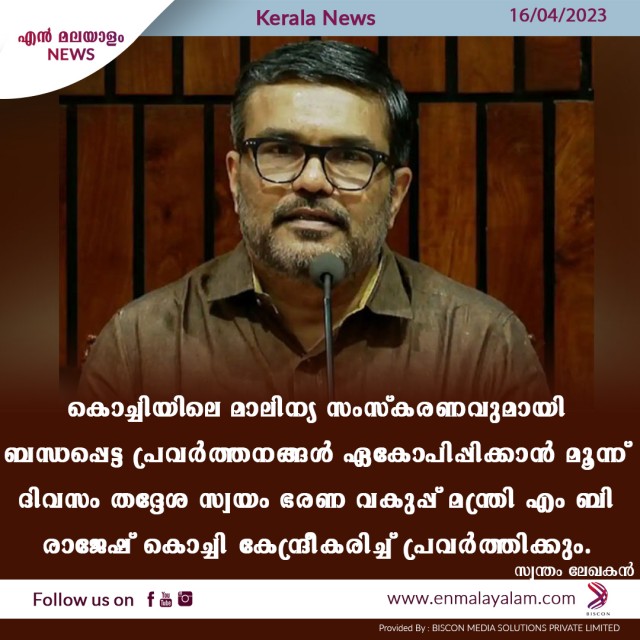 കൊച്ചിയിലെ മാലിന്യ സംസ്കരണവുമായി ബന്ധപ്പെട്ട പ്രവർത്തനങ്ങൾ ഏകോപിപ്പിക്കാൻ മൂന്ന് ദിവസം തദ്ദേശ സ്വയം ഭരണ വകുപ്പ് മന്ത്രി എം ബി രാജേഷ് കൊച്ചി കേന്ദ്രീകരിച്ച് പ്രവർത്തിക്കും.
