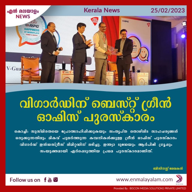 കൊച്ചി: സുസ്ഥിരതയെ പ്രോത്സാഹിപ്പിക്കുകയും സംതൃപ്ത തൊഴിലിട സാഹചര്യങ്ങള് ഒരുക്കുന്നതിലും മികവ് പുലര്ത്തുന്ന കമ്പനികള്ക്കുള്ള ഗ്രീൻ ഓഫിസ് പുരസ്കാരം വി-ഗാര്ഡ് ഇന്ഡസ്ട്രീസ് ലിമിറ്റഡിന് ലഭിച്ചു. ഇന്ത്യാ ടുഡേയും ആര്പിജി ഗ്രൂപ്പും സംയുക്തമായി ഏര്പ്പെടുത്തിയ പ്രഥമ പുരസ്കാരമാണിത്. മുംബൈയില് നടന്ന ഹാപ്പിനെസ് അറ്റ് വര്ക്ക്പ്ലേസ് സമ്മിറ്റില് വി-ഗാര്ഡ് ഇന്ഡസ്ട്രീസ്, എച്ച്ആർ ആന്റ് അഡ്മിനിസ്ട്രേഷൻ, വൈസ് പ്രസിഡന്റ്, പി ടി ജോർജ് മഹരാഷ്ട്ര വ്യവസായ വകുപ്പു മന്ത്രി ഉദയ് സാമന്തില് നിന്നും പുരസ്കാരം ഏറ്റുവാങ്ങി.