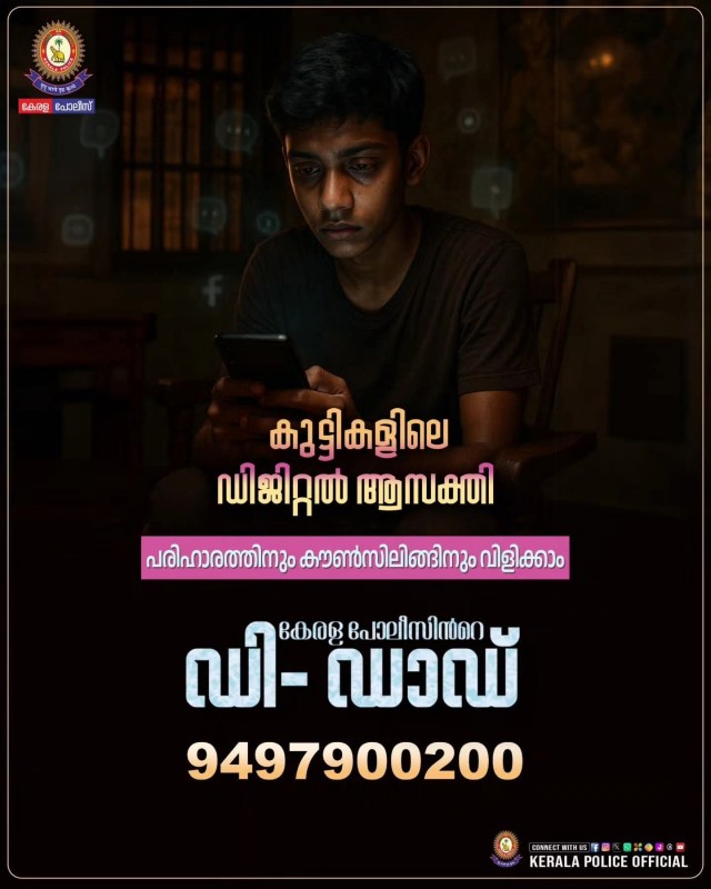 വര്ധിച്ചു വരുന്ന ഡിജിറ്റല് ഉപകരണങ്ങളുടെ ഉപയോഗം കുട്ടികളിലും മുതിര്ന്നവരിലും ഒരുപോലെ പ്രശ്നങ്ങളുണ്ടാക്കുന്നു. അമിതമായ സ്ക്രീന് ടൈം പഠനത്തെയും സാമൂഹിക ഇടപെടലുകളെയും ബാധിക്കുമ്പോള്, സഹായത്തിനായി കേരള പോലീസിന്റെ 'ഡി-ഡാഡ്' (D-Dad) അഥവാ ഡിജിറ്റല് ഡി-അഡിക്ഷന് പദ്ധതി രംഗത്തുണ്ട്. കേരള പോലീസ് സോഷ്യല് പൊലീസിങ് വിഭാഗത്തിന്റെ നേതൃത്വത്തില് കുട്ടികളിലെ മൊബൈല്, ഇന്റര്നെറ്റ് അടിമത്തത്തെ നിയന്ത്രിക്കുന്നതിനായി ആരംഭിച്ച പദ്ധതിയാണ് ഡി-ഡാഡ്. കൗണ്സിലിങ്ങിലൂടെ കുട്ടികള്ക്ക് ഡിജിറ്റല് അടിമത്തത്തില് നിന്ന് മോചനം നല്കുക എന്നതാണ് ഈ പദ്ധതിയുടെ ലക്ഷ്യം.