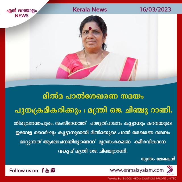 മിൽമ പാൽശേഖരണ സമയം പുന:ക്രമീകരിക്കും : മന്ത്രി ജെ. ചിഞ്ചു റാണി.