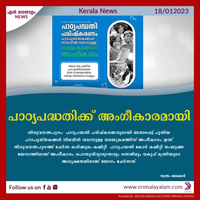 പ്രീ സ്കൂൾ, 1,3,5,7,9 ക്ളാസുകൾക്ക് 2024-25 അക്കാദമിക വർഷവും 2,4,6,8,10 ക്ളാസുകൾക്ക് 2025-26 അക്കാദമിക വർഷവും പുതിയ പാഠപുസ്തകത്തിലാണ് അധ്യയനം നടക്കുക. ഈ മാസം 31 ന് പൊസിഷൻ പേപ്പറുകൾ പൂർത്തിയാക്കും. മാർച്ച് 31 ന് കരിക്കുലം ഫ്രെയിംവർക്ക് പ്രസിദ്ധീകരിക്കും. ഏപ്രിൽ മാസത്തോട് കൂടി ടെക്സ്റ്റ്ബുക്ക് രചന ആരംഭിക്കും. ആദ്യഘട്ട ടെക്സ്റ്റ്ബുക്ക് രചന ഈ വർഷം ഒക്ടോബർ 31 നകം പൂർത്തിയാക്കും.