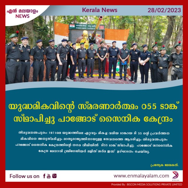 യുദ്ധമികവിൻ്റെ സ്മരണാർത്ഥം T-55 ടാങ്ക് സ്ഥാപിച്ചു പാങ്ങോട് സൈനിക കേന്ദ്രം