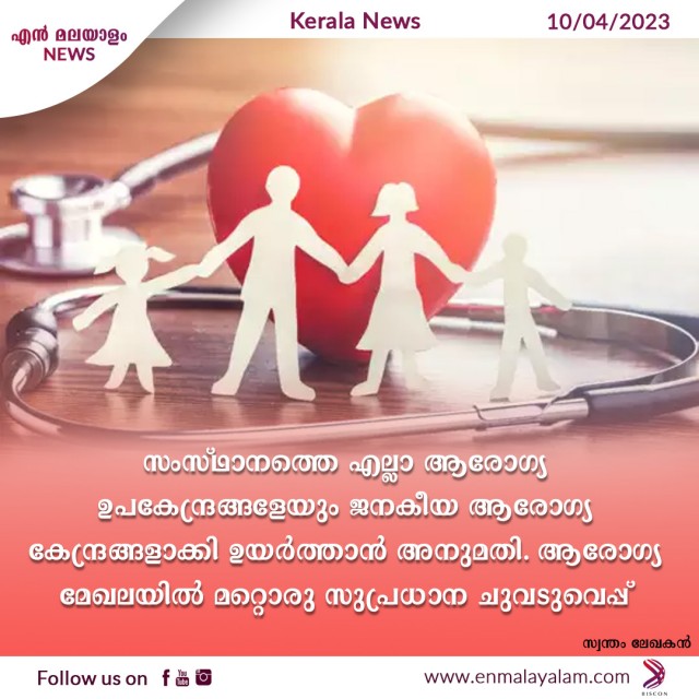 സംസ്ഥാനത്തെ എല്ലാ ആരോഗ്യ ഉപകേന്ദ്രങ്ങളേയും ജനകീയ ആരോഗ്യ കേന്ദ്രങ്ങളാക്കി ഉയര്ത്താന് അനുമതി. ആരോഗ്യ മേഖലയില് മറ്റൊരു സുപ്രധാന ചുവടു വെപ്പ്