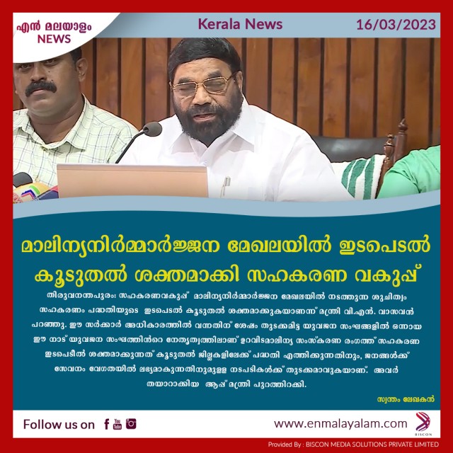 തിരുവനന്തപുരം: സഹകരണവകുപ്പ് മാലിന്യനിര്മ്മാര്ജ്ജന മേഖലയില് നടത്തുന്ന ശുചിത്വം സഹകരണം പദ്ധതിയുടെ ഇടപെടല് കൂടുതല് ശക്തമാക്കുകയാണന്ന് മന്ത്രി വി.എൻ. വാസവൻ പറഞ്ഞു. ഈ സര്ക്കാര് അധികാരത്തില് വന്നതിന് ശേഷം തുടക്കമിട്ട യുവജന സംഘങ്ങളില് ഒന്നായ ഈ നാട് യുവജന സംഘത്തിന്റെ നേതൃത്വത്തിലാണ് ഉറവിടമാലിന്യ സംസ്കരണ രംഗത്ത് സഹകരണ ഇടപെടീല് ശക്തമാക്കുന്നത് കൂടുതല് ജില്ലകളിലേക്ക് പദ്ധതി എത്തിക്കുന്നതിനും, ജനങ്ങള്ക്ക് സേവനം വേഗതയില് ലഭ്യമാകുന്നതിനുമുള്ള നടപടികള്ക്ക് തുടക്കമാവുകയാണ്. അവര് തയാറാക്കിയ ആപ്പ് മന്ത്രി പുറത്തിറക്കി. മാലിന്യസംസ്കരണമേഖലയില് ഒരു സര്വ്വീസ് പ്രൊവൈഡര് ആപ്പ് പുറത്തിറക്കുന്നത് വളരെ അഭിമാനകരമായ കാര്യമാണ്. മേഖലയില് ഇടനാട് സഹകരണ് സംഘം നടപ്പിലാക്കുന്ന പ്രവര്ത്തനങ്ങള് ഇതിലൂടെ അറിയാന് സാധിക്കും.