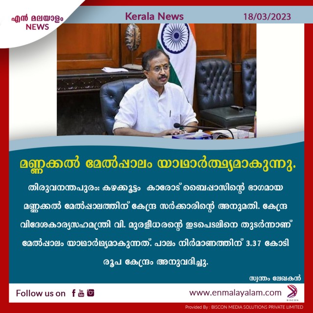 തിരുവനന്തപുരം: കഴക്കൂട്ടം - കാരോട് ബൈപ്പാസിൻ്റെ ഭാഗമായ മണ്ണക്കൽ മേൽപ്പാലത്തിന് കേന്ദ്ര സർക്കാരിൻ്റെ അനുമതി. കേന്ദ്ര വിദേശകാര്യസഹമന്ത്രി വി. മുരളീധരൻ്റെ ഇടപെടലിനെ തുടർന്നാണ് മേൽപ്പാലം യാഥാർഥ്യമാകുന്നത്. പാലം നിർമാണത്തിന് 3.37 കോടി രൂപ കേന്ദ്രം അനുവദിച്ചു. ബൈപ്പാസ് നിർമ്മാണത്തിന്റെ ഭാഗമായി ഉണ്ടായ യാത്രാക്ലേശത്തിന് അടിയന്തര പരിഹാരമുണ്ടാക്കണമെന്ന് കേന്ദ്ര റോഡ്, ഗതാഗത, ഹൈവേ മന്ത്രി .നിതിൻ ഗഡ്കരിയോട് വി. മുരളീധരൻ അഭ്യർഥിച്ചിരുന്നു. ജനങ്ങൾക്ക് നൽകിയ ഉറപ്പ് യാഥാർഥ്യമാക്കാൻ കഴിഞ്ഞത് വ്യക്തിപരമായും ചാരിതാർഥ്യമേകുന്നുവെന്ന് കേന്ദ്രമന്ത്രി പ്രതികരിച്ചു. ധ്രുതഗതിയിൽ നടപടിയെടുത്ത ഗഡ്കരിക്ക് പ്രത്യേകം നന്ദി പറയുന്നതായും വി മുരളീധരൻ പറഞ്ഞു.