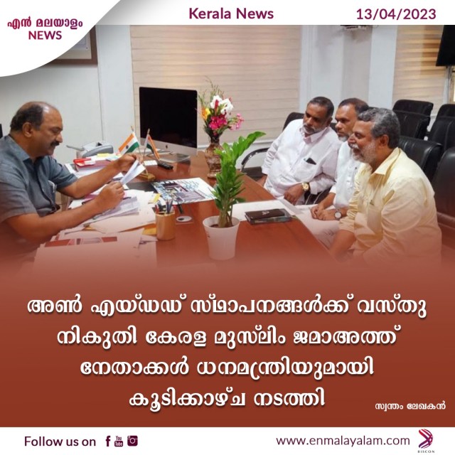 അണ് എയ്ഡഡ് സ്ഥാപനങ്ങള്ക്ക് വസ്തു നികുതി കേരള മുസ്ലിം ജമാഅത്ത് നേതാക്കള് ധനമന്ത്രിയുമായി കൂടിക്കാഴ്ച നടത്തി