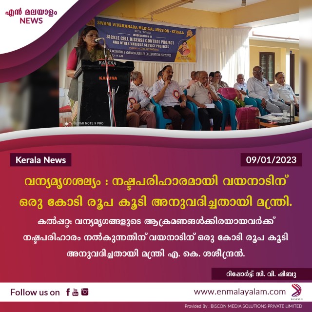 കൽപ്പറ്റ: രാജ്യത്ത് അരിവാൾ രോഗം ഇല്ലാതാക്കുന്നതിന് വിവേകാനന്ദ മെഡിക്കൽ മിഷനും ഡോ.ധനഞ്ജയും നടത്തുന്ന പ്രവർത്തനങ്ങൾ ശ്ലാഘനീയമാണന്നും മന്ത്രി പറഞ്ഞു. സ്വാമി വിവേകാനന്ദ മെഡിക്കൽ മിഷൻ സുവർണ്ണ ജൂബിലിയോടനുബന്ധിച്ച് അരിവാൾ രോഗ നിവാരണ പദ്ധതിയുടെ ഉദ്ഘാടനം നിർവ്വഹിക്കവെയാണ് മന്ത്രി ഇക്കാര്യം പറഞ്ഞത്. വയനാട്ടിൽ ട്രൈബൽ സർവ്വകലാശാലയും മെഡിക്കൽ കോളേജും ആരംഭിക്കുന്നതിന് ശ്രമിക്കുമെന്നും വയനാടിൻ്റെ പ്രശ്നങ്ങളും ഗോത്ര ജനതയുടെ പ്രശ്നങ്ങളും പ്രധാനമന്ത്രിയുടെ ശ്രദ്ധയിൽപ്പെടുത്തുമെന്നും മന്ത്രി രേണുക സിംഗ് സരുത പറഞ്ഞു. സേവാ ഇന്റർ നാഷണലിന്റെ സഹായ സഹകരണത്തോടെ. ജില്ലയെ സമ്പൂർണ്ണ അരിവാൾ രോഗമുക്തമാക്കുകയെന്ന ഉദ്ദേശേത്തോടെയാണ് പദ്ധതി നടപ്പാക്കുന്നത്.. സംസ്ഥാനത്ത് രോഗം സ്ഥിരീകരിക്കപ്പെട്ട അട്ടപ്പാടി പോലുള്ള പ്രദേശങ്ങളിലും സംസ്ഥാന അതിർത്തി ജില്ലകളായ നീലഗിരി, ചാമരാജ് നഗർ, തുടങ്ങിയ പ്രദേശങ്ങളും പദ്ധതിയിൽ ഉൾപ്പെടും. ജില്ലയിൽ രോഗ നിർണ്ണയത്തിനായി 250 രോഗ നിർണ്ണയ ക്യാമ്പുകൾ സംഘടിപ്പിച്ച് രക്ത സാമ്പിളുകൾ പരിശോധിക്കും. ഇതിനാവശ്യമായ അത്യാധുനിക ലാബോറട്ടറി, മിഷനറി സംവിധാനങ്ങൾ എന്നിവ മിഷൻ ആശുപ്രതിയിൽ സജ്ജീകരിച്ചിട്ടുണ്ട്. ഇതോടൊപ്പം തന്നെ രോഗനിയന്ത്രണത്തിന് ആവശ്യമായ ബോധവൽക്കരണ ക്യാമ്പുകൾ, കൗൺസിലിംഗ് തുടങ്ങിയ പരിപാടികളും ഉണ്ടാകും, പദ്ധതി കാലഘട്ടത്തിൽ രോഗ നിർണ്ണയവും ചികിത്സയും സൗജന്യമാണ്. 1972 ൽ സന്നദ്ധ പ്രസ്ഥാനമായി ആരംഭിച്ച് മിഷൻ സുവർണ്ണ ജൂബിലി വർഷത്തോടനുബന്ധിച്ച് ഒട്ടനവധി സേവന പദ്ധതികൾക്കും തുടക്കം കുറിച്ചു.: ചടങ്ങിൽ സ്വാമി വിവേകാനന്ദ മെഡിക്കൽ മിഷൻ പ്രസിഡണ്ട് ഡോ. പി. നാരായണൻ നായർ അധ്യക്ഷത വഹിച്ചു. നാഷണൽ ജോയിൻ്റ് ഓർഗനൈസിംഗ് സെക്രട്ടറി പി. പി. രമേഷ് ബാബു മുഖ്യ പ്രഭാഷണവും സെക്രട്ടറി അഡ്വ. കെ. എ. അശോകൻ റിപ്പോർട്ടവതരണവും നടത്തി. ജില്ലാ ഭരണകൂടത്തെ പ്രതിനിധീകരിച്ച് എ. ഡി. എം. എൻ. ഐ. ഷാജു പരിപാടിയിൽ സംബന്ധിച്ചു.