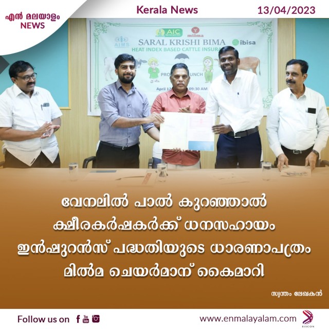 വേനലില് പാല് കുറഞ്ഞാല് ക്ഷീരകര്ഷകര്ക്ക് ധനസഹായം ഇന്ഷുറന്സ് പദ്ധതിയുടെ ധാരണാപത്രം മില്മ ചെയര്മാന് കൈമാറി