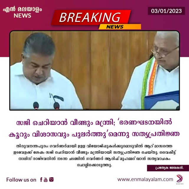 ഭരണഘടനയെ അധിക്ഷേപിച്ച് പ്രസംഗിച്ചതിനെ ചൊല്ലി ആറ് മാസം മുമ്പാണ് അദ്ദേഹം മന്ത്രിസഭയില് നിന്ന് രാജിവെച്ചത്. ഇതുമായി ബന്ധപ്പെട്ടകേസ് നിലനില്ക്കുമ്പോള് സജി ചെറിയാന് മന്ത്രിയാകുന്നതിനോടുള്ള വിയോജിപ്പ് ഗവര്ണര് മുഖ്യമന്ത്രിയെ ഫോൺ വിളിച്ചറിയിച്ച ശേഷമാണ് സത്യപ്രതിജ്ഞയ്ക്ക് അനുമതി നല്കിയത്. മുഖ്യമന്ത്രി നിര്ദേശിക്കുന്നയാള്ക്ക് സത്യവാചകം ചൊല്ലിക്കൊടുക്കാനുള്ള ഭരണഘടനാ ബാധ്യത നിറവേറ്റുകയാണെന്നാണ് ഇതേക്കുറിച്ച് ഗവര്ണര് പ്രതികരിച്ചത്.