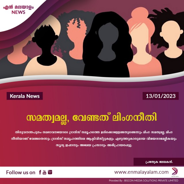 തിരുവനന്തപുരം: സമഭാവനയോടെ ട്രാൻസ് സമൂഹത്തെ ഉൾക്കൊള്ളേണ്ടതുണ്ടെന്നും ലിംഗ സമത്വമല്ല, ലിംഗ നീതിയാണ് വേണ്ടതെന്നും ട്രാൻസ് സമൂഹത്തിലെ ആക്ടിവിസ്റ്റുകളും എഴുത്തുകാരുമായ വിജയരാജമല്ലികയും സൂര്യ ഇഷാനും അമേയ പ്രസാദും അഭിപ്രായപ്പെട്ടു. നിയമസഭാ അന്താരാഷ്ട്ര പുസ്തകമേളയുടെ ഭാഗമായി നടന്ന 'മലയാളത്തിലെ മഴവിൽ അനുഭവങ്ങൾ' എന്ന പാനൽ ചർച്ചയിലാണ് ട്രാൻസ് സമൂഹം നേരിടുന്ന വെല്ലുവിളികളെക്കുറിച്ചും ആവശ്യമായ നടപടികളെക്കുറിച്ചും അവർ മനസ്സുതുറന്നത്.