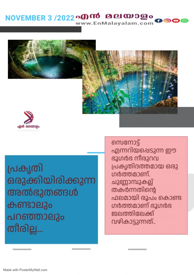 പ്രകൃതി ഒരുക്കിയിരിക്കുന്ന അൽഭുതങ്ങൾ കണ്ടാലും പറഞ്ഞാലും തീരില്ല… ചിലപ്പോൾ അവ വിശ്വസിക്കാൻ പോലും പ്രയാസമാണ്, മെക്സിക്കോയിലെ ഈ ഭൂഗർഭ പ്രകൃതിദത്ത നീരുറവ അതിലൊന്നാണ്. സെനോട്ട് എന്നറിയപ്പെടുന്ന ഈ ഭൂഗർഭ നീരുറവ പ്രകൃതിദത്തമായ ഒരു ഗർത്തമാണ്. ചുണ്ണാമ്പുകല്ല് തകർന്നതിന്റെ ഫലമായി രൂപം കൊണ്ട ഗർത്തമാണ് ഭൂഗർഭ ജലത്തിലേക്ക് വഴികാട്ടുന്നത്.ദശലക്ഷക്കണക്കിന് വർഷങ്ങളായി, മഴ ചുണ്ണാമ്പുകല്ല് നശിപ്പിക്കുകയും ഭൂഗർഭ ഗുഹകളുടെ ഒരു വലിയ സംവിധാനം രൂപപ്പെടുകയും ചെയ്തു.മഴയിലൂടെയും ഭൂഗർഭ നീരുറവകളിലൂടെയും ഗർത്തതിന് അകത്ത് വെള്ളം നിറഞ്ഞു.വെള്ളം നിറഞ്ഞ ഒരു ഗുഹയുടെ മേൽക്കൂര ഇല്ലാതാവുമ്പോൾ ആണ് ഒരു സെനോട്ട് ജനിക്കുന്നത്.സെനോട്ടുകൾ, കൂടുതലും മെക്സിക്കോയിലെ യുകാറ്റൻ പെനിൻസുലയുമായി ബന്ധപ്പെട്ടിരിക്കുന്നു.യുകാറ്റൻ പെനിൻസുലയിൽ ഏകദേശം 7,000 സെനോട്ടുകൾ ആണ് കണ്ടെത്തിയത്.സൂര്യപ്രകാശത്തിന്റെ കിരണങ്ങൾ ഗർത്തത്തിലൂടെ അകത്തേക്ക് ചെല്ലുകയും ജലത്തിന് ഒരു മാന്ത്രിക തിളക്കം നൽകുകയും ചെയ്യുന്നു.ജലത്തിന് ഒരു മാന്ത്രിക തിളക്കം നൽകുകയും ചെയ്യുന്നു. ആ കാഴ്ച വളരെ ഗംഭീരമാണ്. നിരവധി പേരാണ് പ്രകൃതി ഒരുക്കിയ ഈ അൽഭുതം കാണാൻ മെക്സിക്കോയിലേക്ക് എത്തുന്നത്.