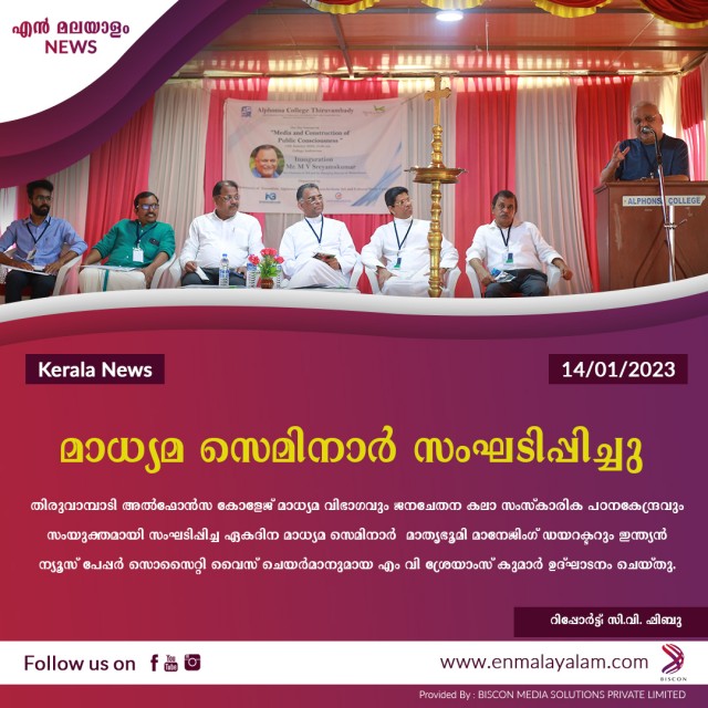 തിരുവാമ്പാടി അൽഫോൻസ കോളേജ് മാധ്യമ വിഭാഗവും ജനചേതന കലാ സംസ്കാരിക പഠനകേന്ദ്രവും സംയുക്തമായി സംഘടിപ്പിച്ച ഏകദിന മാധ്യമ സെമിനാർ മാതൃഭൂമി മാനേജിംഗ് ഡയറക്ടറും ഇന്ത്യൻ ന്യൂസ് പേപ്പർ സൊസൈറ്റി വൈസ് ചെയർമാനുമായ എം വി ശ്രേയാംസ് കുമാർ ഉദ്ഘാടനം ചെയ്തു. ദേശീയ മാധ്യമ പുരസ്കാരം നേടിയ മാതൃഭൂമി സീനിയർ സബ് എഡിറ്റർ അനു അബ്രഹാമിനെ ആദരിച്ചു. അച്ചടി - സമുഹമാധ്യമങ്ങളുമായി ബന്ധപ്പെട്ട വിവിധ സെഷനുകളിൽ കെ എഫ്ജോർജ് ( മലയാള മനോരമ) അനു അബ്രാഹം (മാതൃഭൂമി) ബൈജു ബാപ്പുട്ടി (ദീപിക) ബി.പി. മൻസൂർ ( ദേശാഭിമാനി ) എന്നിവർ വിഷയാവതരണം നടത്തി. സോഷ്യൽ മീഡിയ രൂപീകരിക്കുന്ന സാമൂഹിക മനസാക്ഷി എന്ന വിഷയത്തിൽ അമീർ സൽമാൻ (മാധ്യമ അധ്യാപകൻ) മുഹമ്മദ് ഷെഫീഖ് (ഏഷ്യാവിലെ ) ജോബി ജോസഫ് (ബ്രാൻഡ് സ്വാമി ) ആനിയമ്മ (ലീഫീ കേരള ) ഫസൽ തിരുവമ്പാടി ( മൊബൈൽ ജേർണലിസ്റ്റ് ) എന്നിവർ പ്രബന്ധങ്ങൾ . അവതരിപ്പിച്ചു. കോളേജ് വൈസ് പ്രിൻസിപ്പൽ ഫാ.ഷെനീഷ് അഗസ്റ്റിൻ പ്രസ്തുത സെഷൻ നിയന്ത്രിച്ചു.