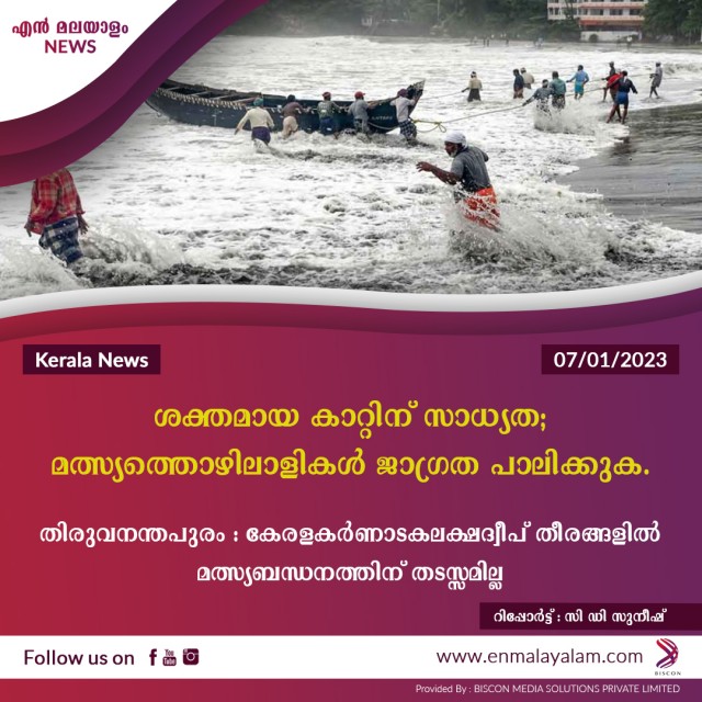ഇന്നും ( ജനുവരി 7) നാളെയും (ജനുവരി 8) ഗൾഫ് ഓഫ് മാന്നാർ, കോമോറിൻ പ്രദേശം എന്നിവിടങ്ങളിൽ മണിക്കൂറിൽ 40 മുതൽ 45 കിലോമീറ്റർ വരെ വേഗതയിൽ വടക്കുകിഴക്ക് ദിശയിൽ നിന്നോ കിഴക്ക് ദിശയിൽ നിന്നോ ശക്തമായ കാറ്റിന് സാധ്യതയുള്ളതായി കേന്ദ്ര കാലാവസ്ഥ വകുപ്പ്. ഈ സാഹചര്യത്തിൽ ഇന്നും നാളെയും ഈ പ്രദേശങ്ങളിൽ മത്സ്യബന്ധനത്തിന് പോകരുതെന്ന് ജില്ലാ കളക്ടർ അറിയിച്ചു. അതേസമയം കേരള-കർണാടക-ലക്ഷദ്വീപ് തീരങ്ങളിൽ മത്സ്യബന്ധനത്തിന് തടസ്സമില്ലെന്നും അറിയിപ്പിൽ പറയുന്നു.