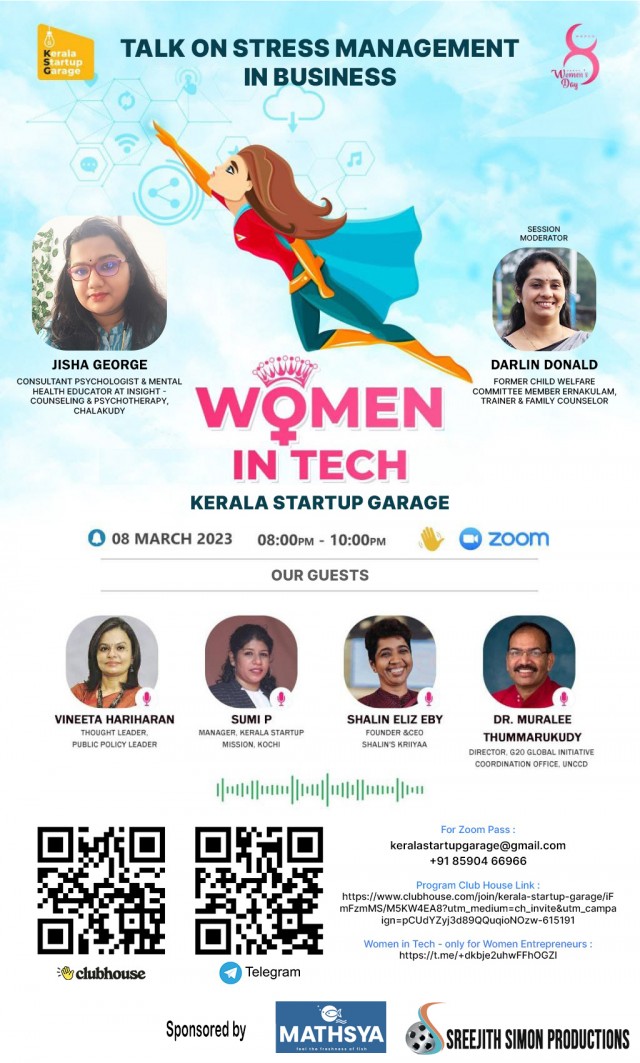 ഇൻ്റർനാഷണൽ വനിതാ ദിനത്തോട് അനുബന്ധിച്ച് കേരള സ്റ്റാർട്ട്അപ് ഗ്യാരേജിൻ്റെ കീഴിൽ സമൂഹത്തിൽ മുൻപന്തിയിലേക്ക് വരാൻ ആഗ്രഹിക്കുന്ന വനിതാ സംരംഭകരെ പ്രോത്സാഹിപ്പി ക്കുന്നതിനായി zoom plus club house live പ്രോഗ്രാം സംഘടിപ്പിക്കുന്നു.